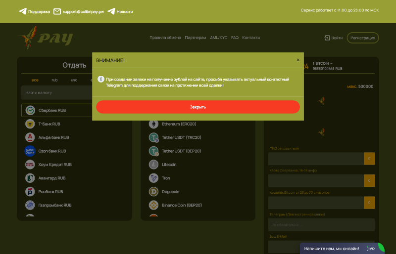 Описание: Сервис для быстрого и выгодного обмена валют. acrub, btc, ltc, eth, trx, usdttrc20, doge, sberrub, tcsbrub, cardrub, ton, bnbbep20, sol, usdtsol, rfbrub, rshbrub, mtsbrub, psbrub, sbprub, usdtbep20, dai, usdcbep20, mircrub